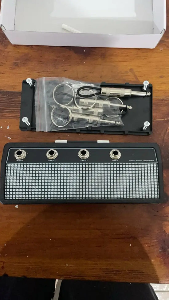 No, this key holder does not emit any musical sound. Its design is inspired by amplifier jack plugs for an original visual effect, but it does not produce music or sound.