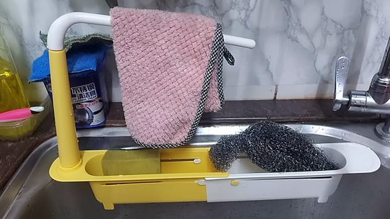 Îmi place să descopăr acest tip de obiecte mici din viața de zi cu zi care schimbă viața. Acest suport pentru chiuvetă este foarte bine gândit, extensibil, iar suportul pentru prosoape deasupra este pur și simplu genial pentru a usca rapid!